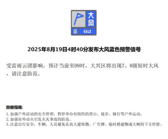 4时40分奕汇网,区气象台发布大风蓝色预警信号:受雷雨云团影响,预计当前至09时,大兴区将出现7、8级短时大风,请注意防范。