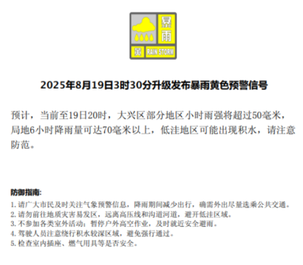 今天3时30分奕汇网,大兴区气象台升级发布暴雨黄色预警信号:预计,当前至19日20时,大兴区部分地区小时雨强将超过50毫米,局地6小时降雨量可达70毫米以上,低洼地区可能出现积水,请注意防范。