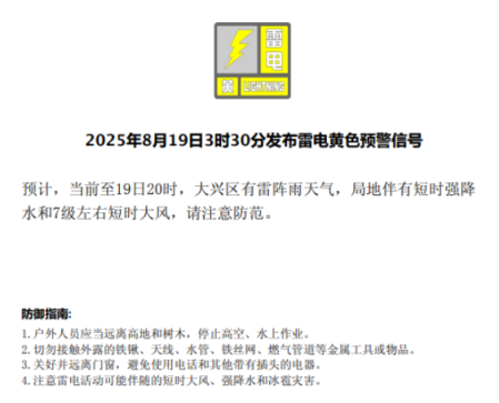 同时3时30分,区气象台发布雷电黄色预警信号:预计,当前至19日20时,大兴区有雷阵雨天气,局地伴有短时强降水和7级左右短时大风,请注意防范。