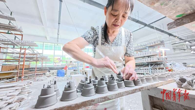 8月20日,福建德化,顺美集团制造间内,工作人员将瓷器胚拼接好。中青报·中青网见习记者 陈思阳/摄
