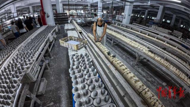 8月20日,福建德化,顺美集团制造间内,工作人员将当地特有的高岭土压入模具中。中青报·中青网见习记者 陈思阳/摄
