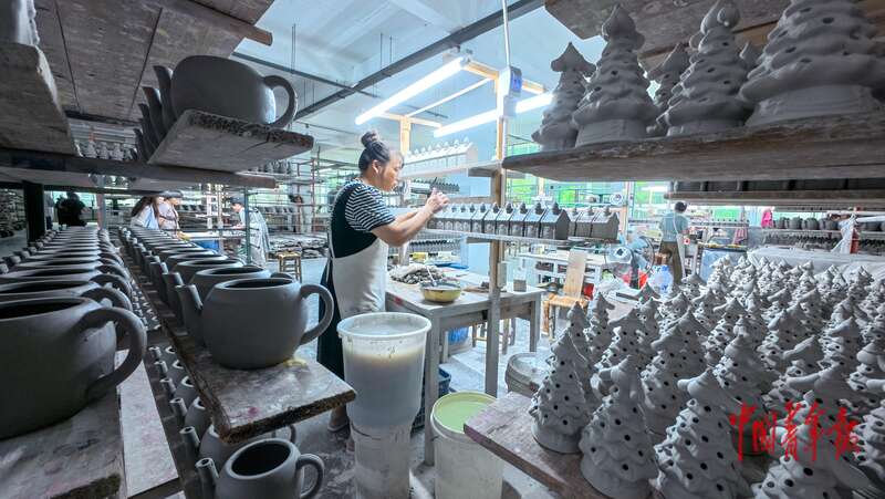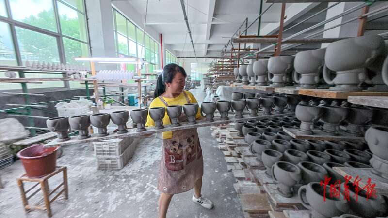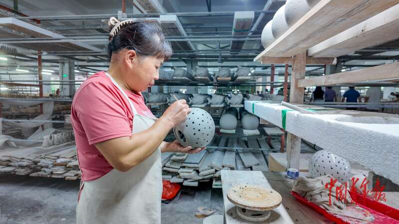 8月20日,福建德化,顺美集团工作人员对烧制好的瓷器胚上色釉。中青报·中青网见习记者 陈思阳/摄