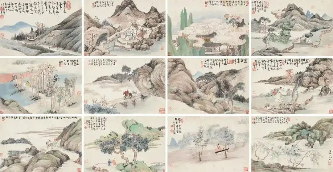 任预的《前人诗意册》十二开,宛如一部用画笔谱写的诗意诗集,在方寸画页间编织出奇幻瑰丽的艺术梦境。